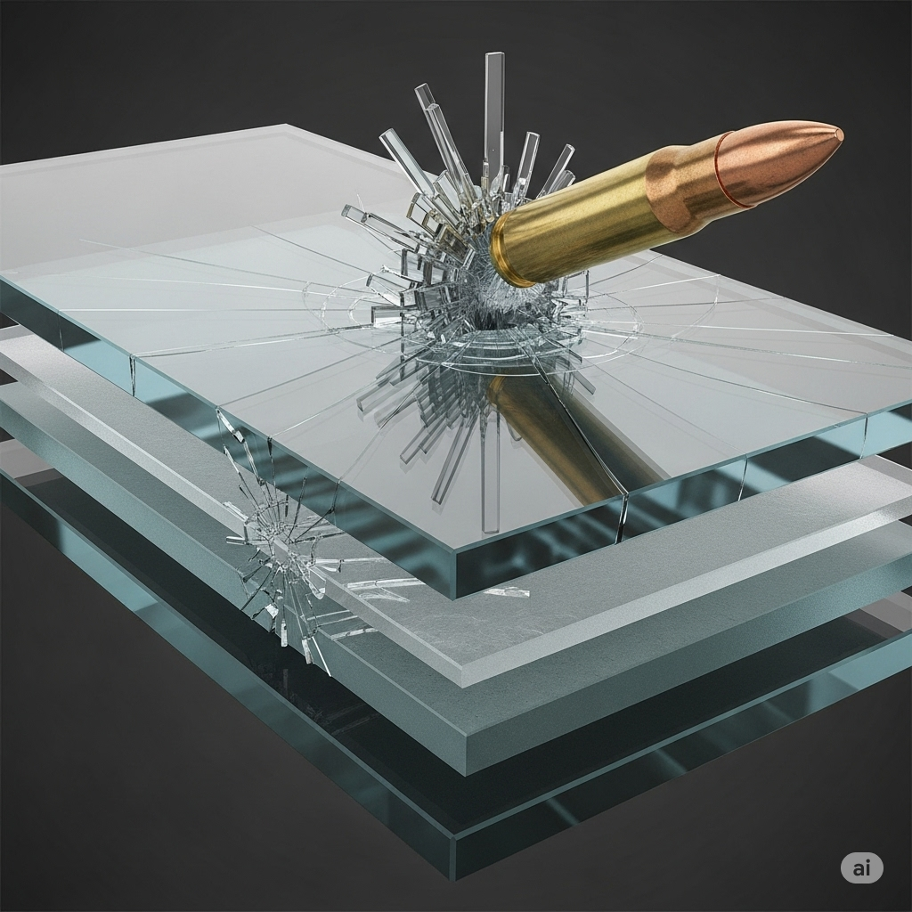หัวใจสำคัญของ กระจกกันกระสุน อยู่ที่โครงสร้างแบบ ลามิเนต (Laminated Glass) ซึ่งเป็นการนำ กระจก หลายชั้นมาประกบกัน โดยปกติจะประกอบด้วย กระจก สองชนิดขึ้นไป: