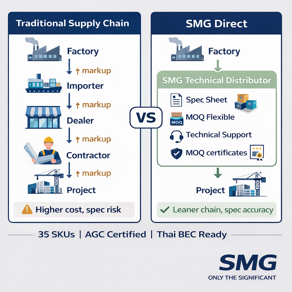 | Distributor มี Technical Knowledge (เช่น SMG) | คุ้มค่า — MOQ ยืดหยุ่น | Spec ถูกต้อง, ตัดตามขนาด, คำปรึกษาฟรี, สต็อกพร้อม | ราคาสูงกว่าโรงงานเล็กน้อย |