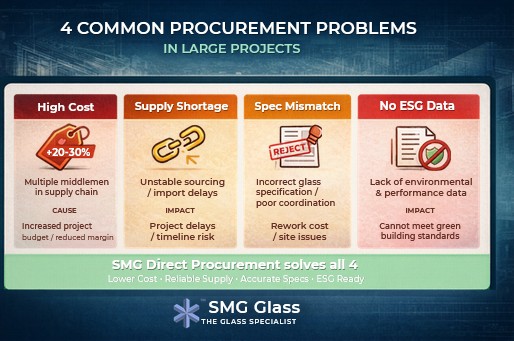 โครงการอาคารขนาดใหญ่ที่ใช้กระจกปริมาณมาก — คอนโด โรงแรม อาคารสำนักงาน — มักเจอปัญหาเดิมซ้ำๆ: ผ่านร้านกลาง markup 20-30% กลัว supply shortage ระหว่างก่อสร้าง spec ไม่ตรง BOQ ต้องแก้กลางทาง SMG ช่วยแก้ปัญหาเหล่านี้ด้วยโมเดล Direct Procurement จากหลายโรงงานคุณภาพ