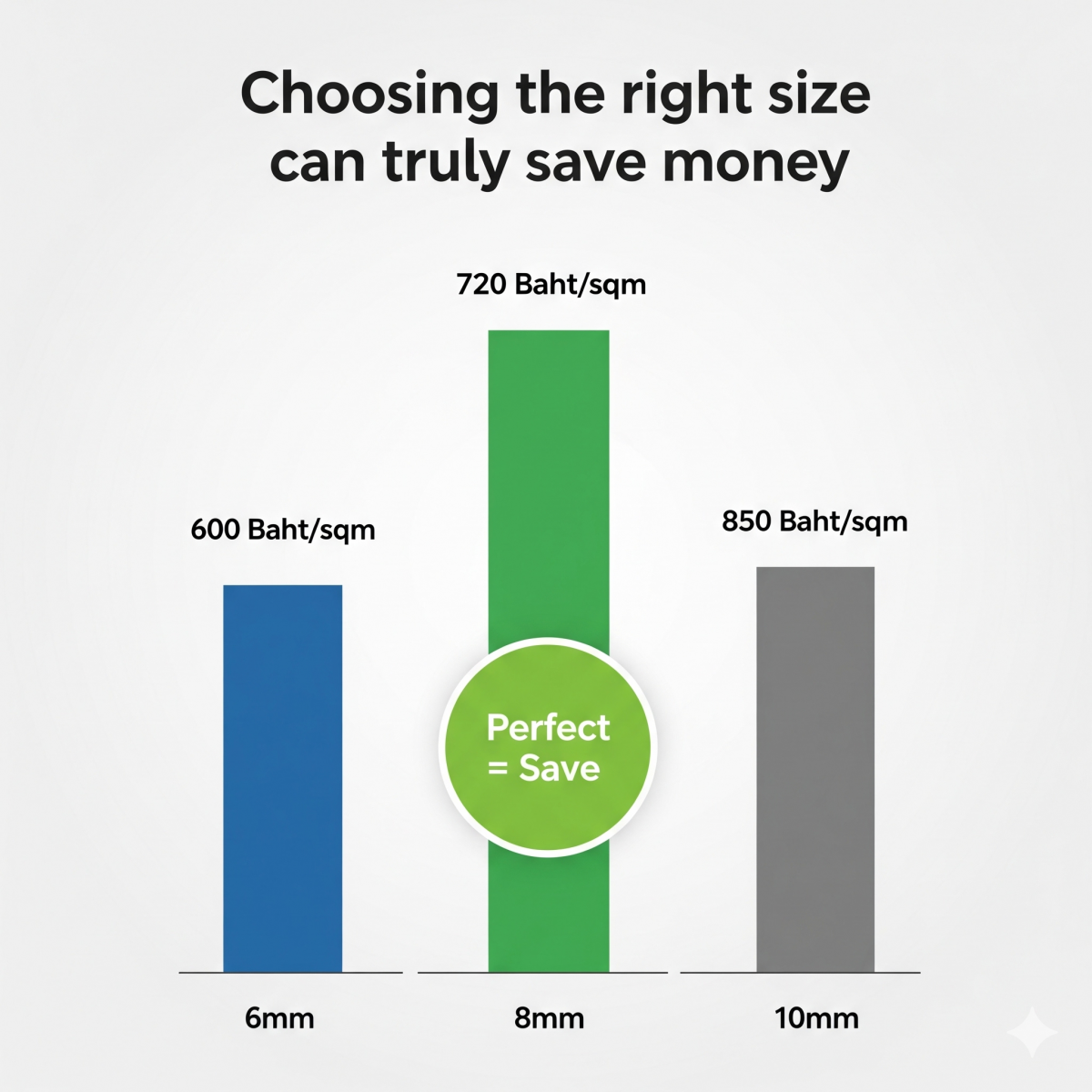 โครงการอาคารสำนักงานที่ใช้กระจก 5,000 ตร.ม. หากซื้อผ่านตัวแทนที่ราคาเฉลี่ย 850 บาท/ตร.ม. จะมีค่าใช้จ่ายรวม 4,250,000 บาท แต่ถ้าซื้อจากโรงงานโดยตรงในราคาเฉลี่ย 720 บาท/ตร.ม.