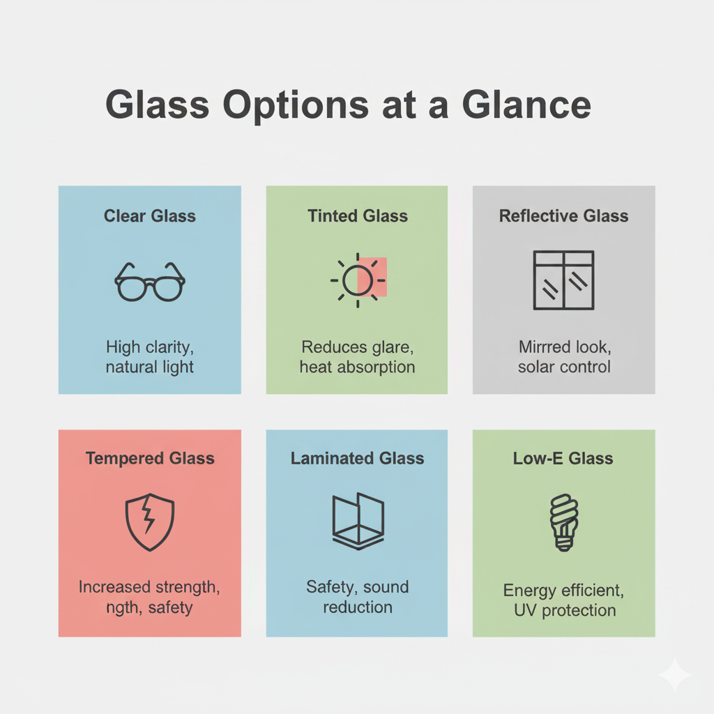 - มีให้เลือกทั้ง Clear Glass, Tinted Glass, Reflective Glass, Tempered Glass, Laminated Glass, Low-E Glass
