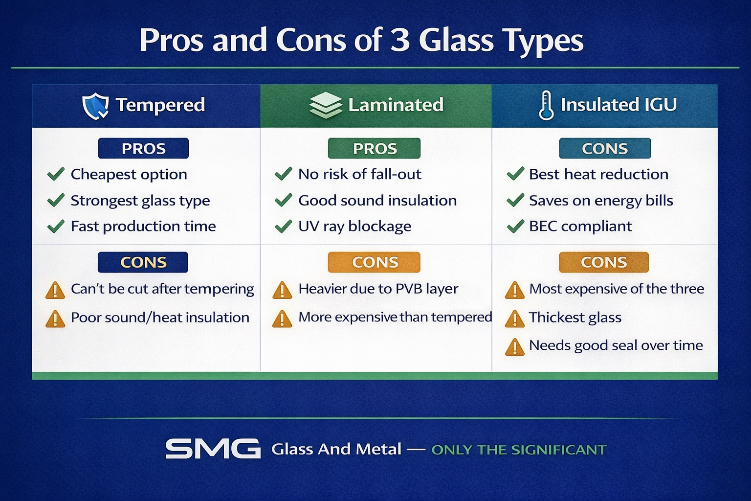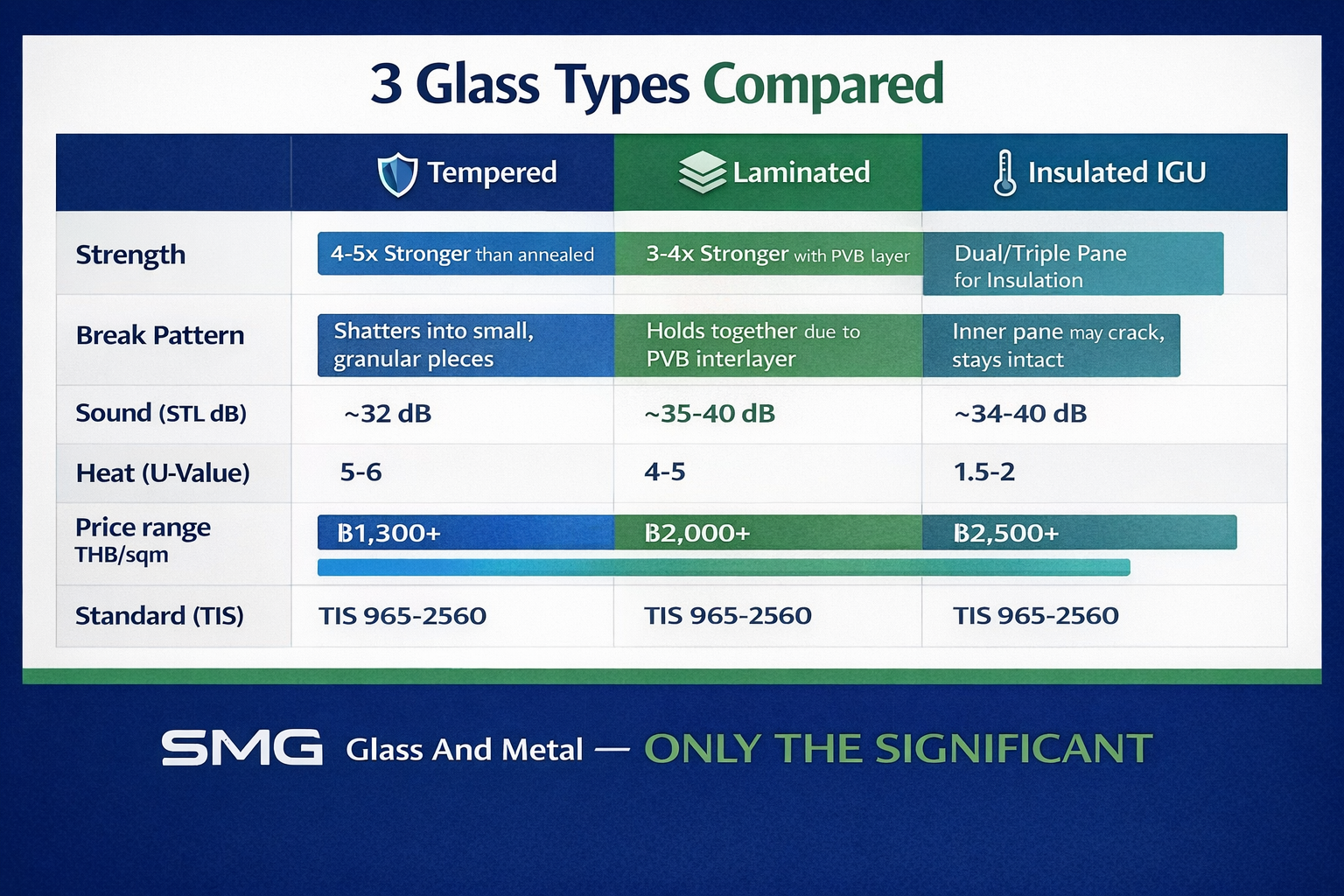 เปรียบเทียบกระจก 3 ชนิดหลักสำหรับงานติดตั้ง: เทมเปอร์ vs ลามิเนต vs อินซูเลท — มุมช่าง