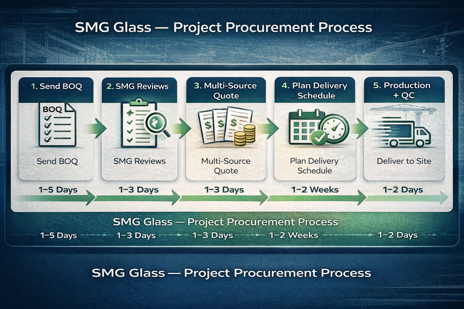SMG รับจัดซื้อกระจกสำหรับโครงการทุกขนาดตั้งแต่อาคารขนาดกลางขึ้นไป ทั้งคอนโด โรงแรม อาคารสำนักงาน โรงงาน และโครงการพาณิชย์ โดยใช้โมเดล Multi-Source จัดหาจากหลายโรงงาน เพื่อให้ตรง spec และงบประมาณ