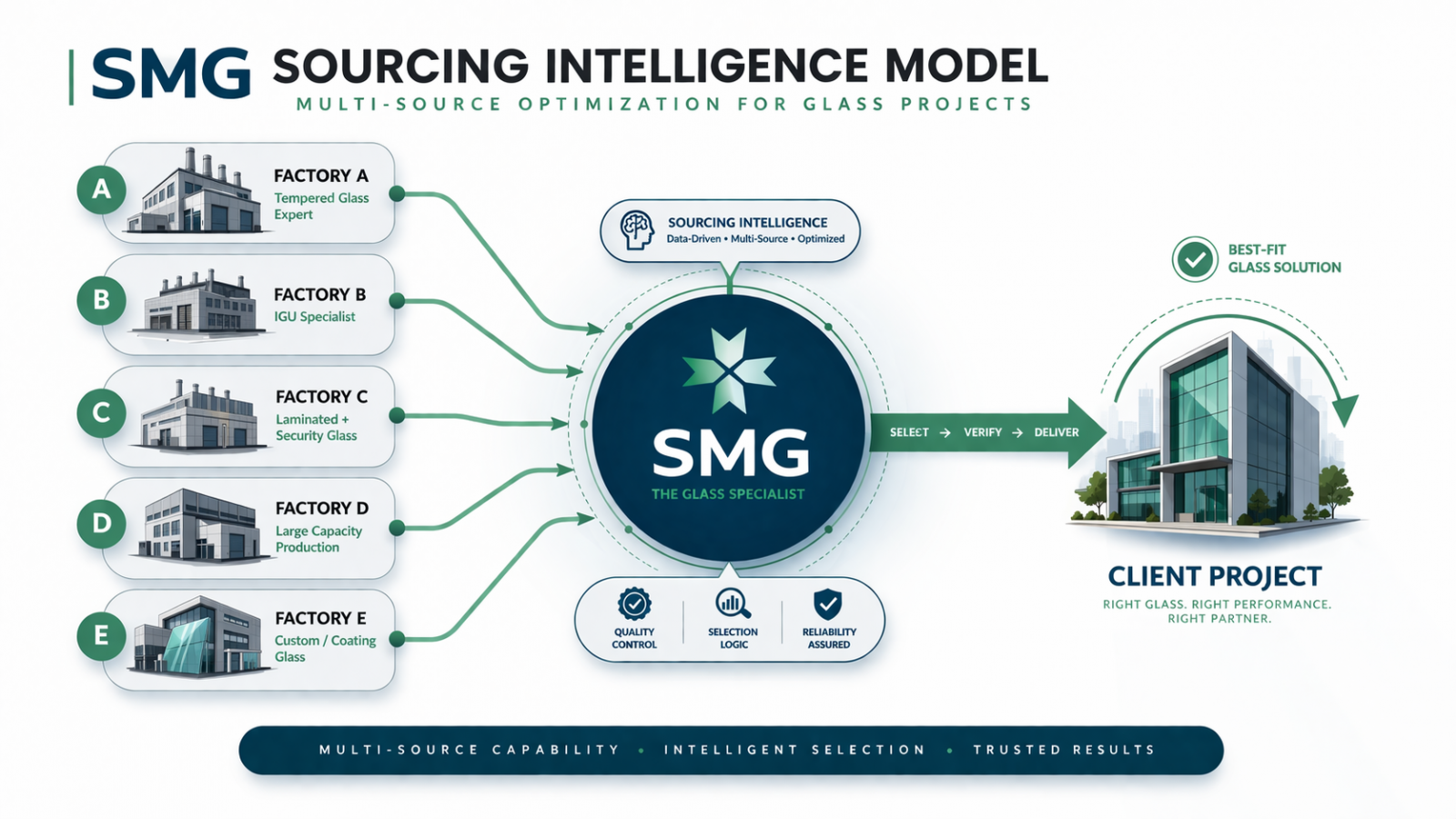 ในตลาดกระจกแปรรูปไทย ผู้จัดจำหน่ายส่วนใหญ่เป็น single-source — ผูกกับโรงงานเดียว ขายได้แค่สินค้าของโรงงานนั้น ถ้าโรงงานมีปัญหา ลูกค้าก็ได้รับผลกระทบไปด้วย SMG ใช้โมเดลต่างออกไปโดยสิ้นเชิง เราเรียกว่า Sourcing Intelligence — ความสามารถในการจัดหากระจกจากหลายโรงงานคุณภาพ เลือก best-fit ให้แต่ละโครงการ